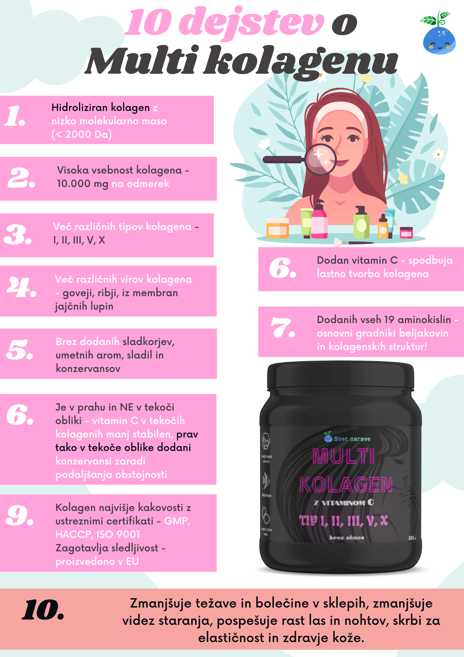 - Več različnih virov (goveji, ribji, svinjski, iz membran jajčnih lupin,..) kolagena